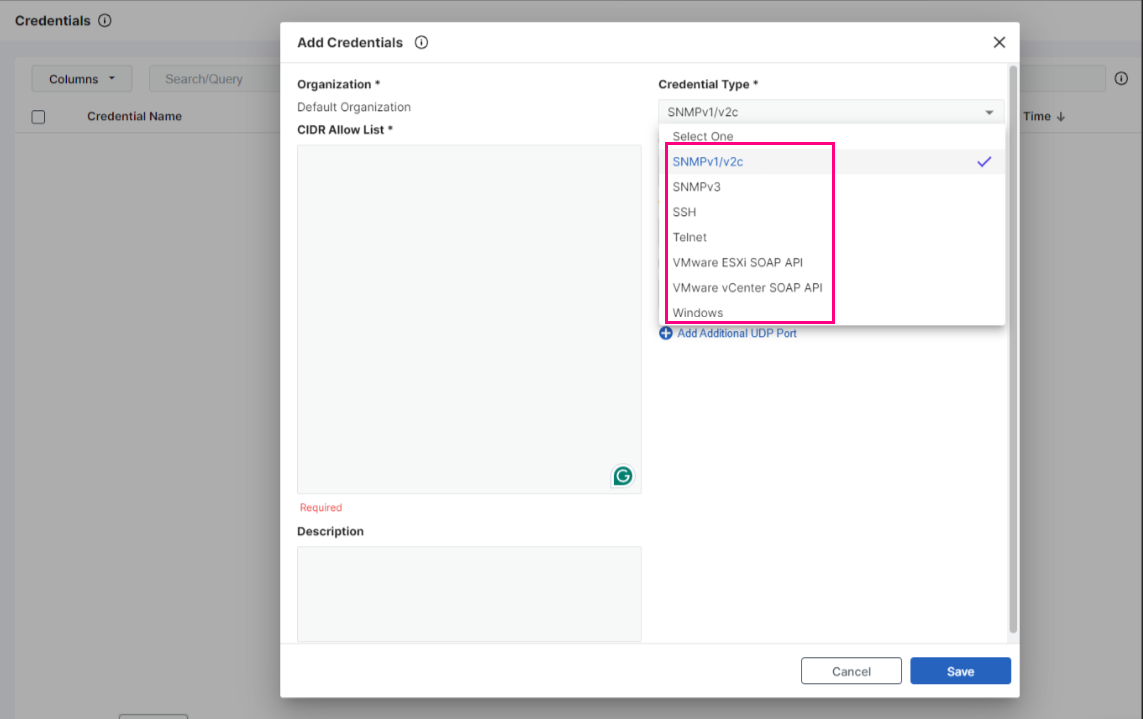 4. In the Credential Type dropdown list, select SNMPv1/v2c, SNMPv3, SSH, Telnet, VMware ESXi SOAP API, VMware vCenter SOAP API, or Windows.