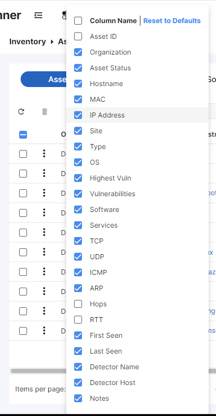 At the top of the Inventory page, you can use the Columns dropdown list to select which columns to display or to reset the columns to the default view.
