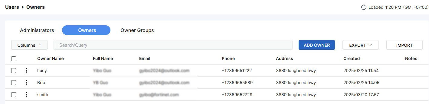 The Owners page allows you to add, edit, import, export, and delete asset owners.