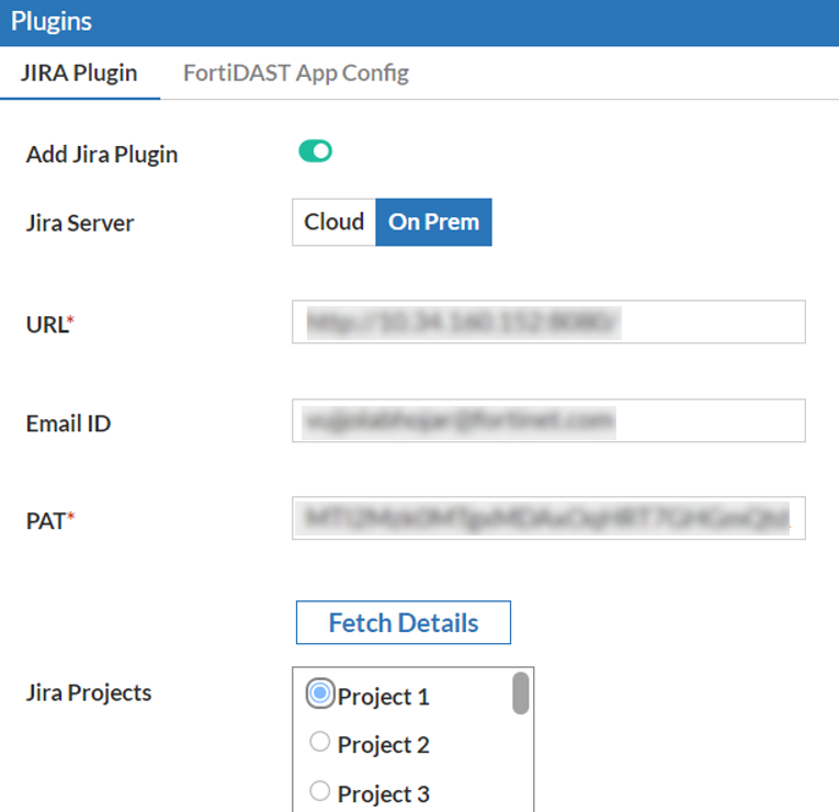 - Jira plugins are supported per FortiDevSec application.