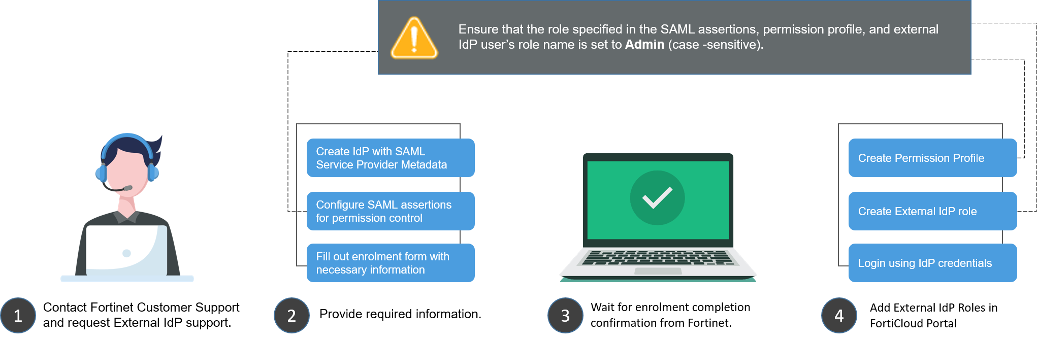 External IdP authentication is offered in conjunction with FortiCare and FortiAuthenticator. To configure external IdP support perform the following steps: