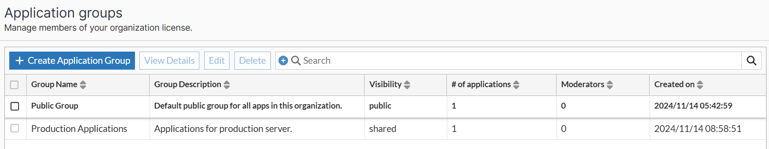 The Application Group page displays a table listing all the application groups. The following information is displayed.