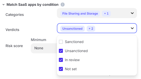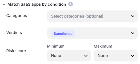 - Match SaaS apps by condition: This method allows you to define the categories, verdicts, and/or a minimum and maximum risk score to match web apps for your allowlist or denylist. If multiple conditions are specified, a SaaS app will match if it has at least one of the defined values for each configured parameter.