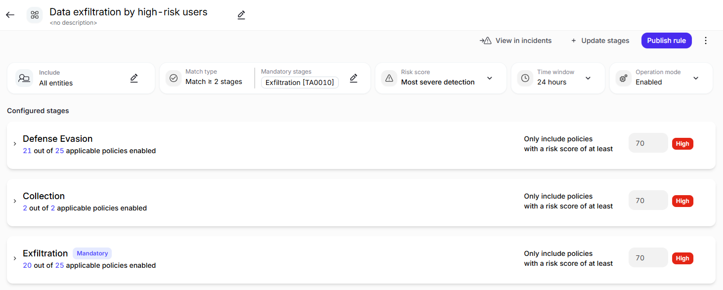 Defined within the Policies module, these rules leverage the MITRE ATT&CK security framework to generate incidents caused by sequences of high-risk activity, such as reconnaissance, data collection, defense evasion, and data exfiltration.