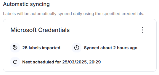 A configuration panel will be added to the Automatic syncing section, detailing the name of the credentials, number of labels synced, time passed since the last sync, and date-time of the next sync.