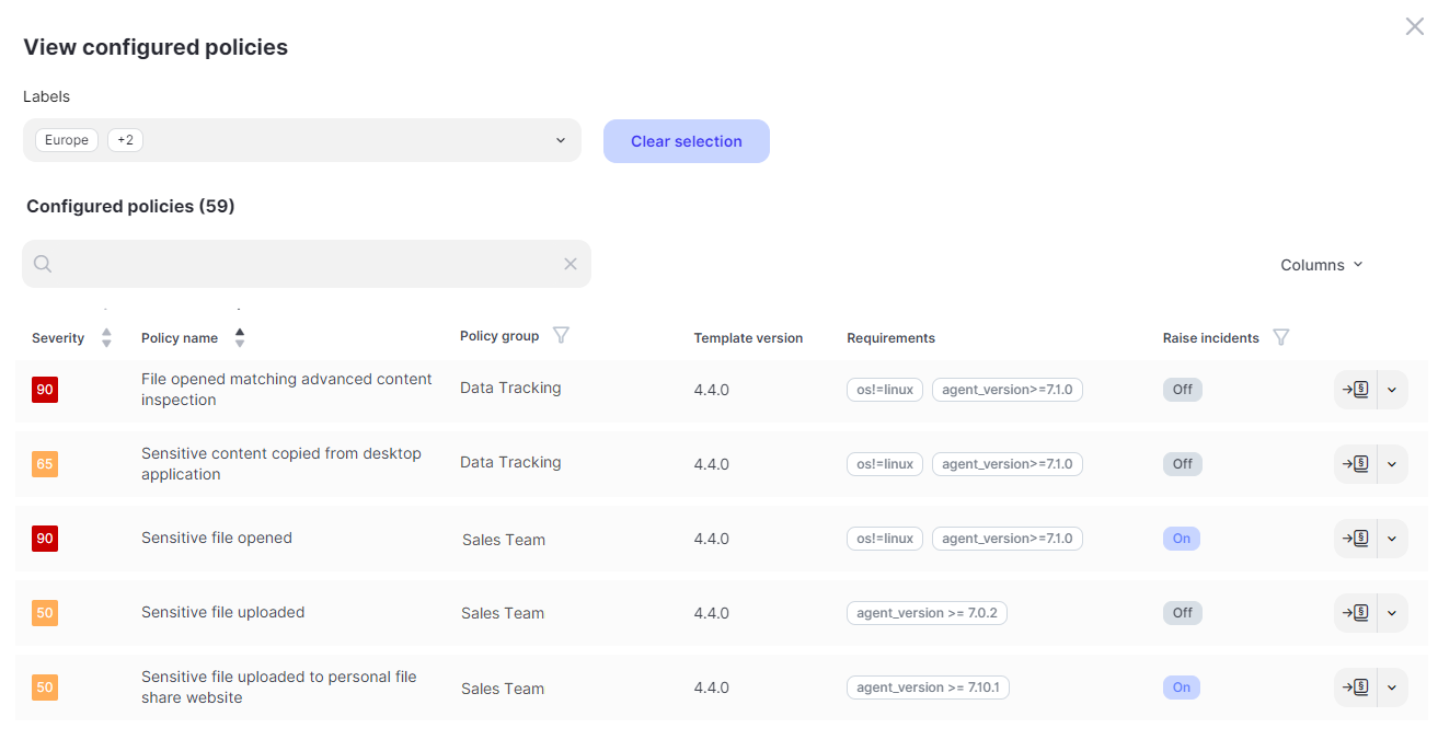 The FortiDLP Console allows you to view configured policies across different policy groups for a given set of labels. This is helpful for identifying which policies are associated with a group of entities.