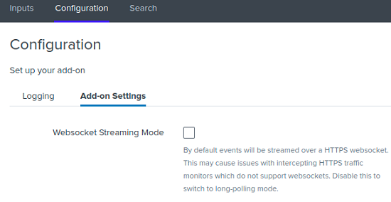 Our technology add-on for Splunk makes integrating with our Event Streaming Service quick and simple. The add-on is already set up to request events for you, minimizing configuration time. By default, the add-on will stream events in websocket mode.