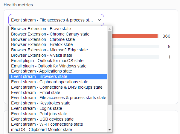 The tab groups nodes by their core deployment details, including their Agent version, OS, OS version, and country, as well as their Agent component state. You can alter the aggregations by selecting different properties or states from their respective menus.