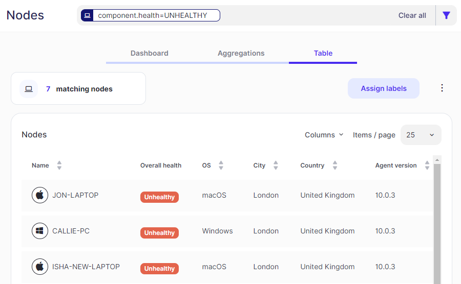 As with the Aggregations tab, you can use the search bar and quick filters to refine the nodes in view, and optionally export node data to CSV and XLSX. Additionally, you can edit nodes' labels, and archive/unarchive them. Further, you can navigate to other pages in the FortiDLP Console related to Agent deployment and configuration.