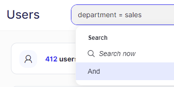 Only AND logic is supported (not OR logic). However, you can use the in or !in operators to apply OR logic in relation to specific properties. For example, to search for users from either the Marketing or the Sales department, enter