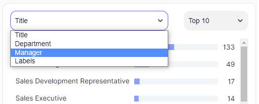 - To modify the aggregations, select different properties from the menus and/or change the Top 10 default. Top menu options show the most common values for a property and Bottom menu options show you the least common values.