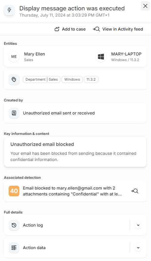 - the related detection and policy for an automated (policy-initiated) action, or the name of the operator for a manual action