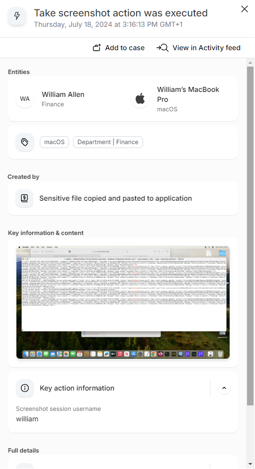 The take screenshot action allows you to capture an image of a user's computer screen. Designed to be used in high-risk situations, this action helps you validate whether a user poses a threat before you take further security measures.