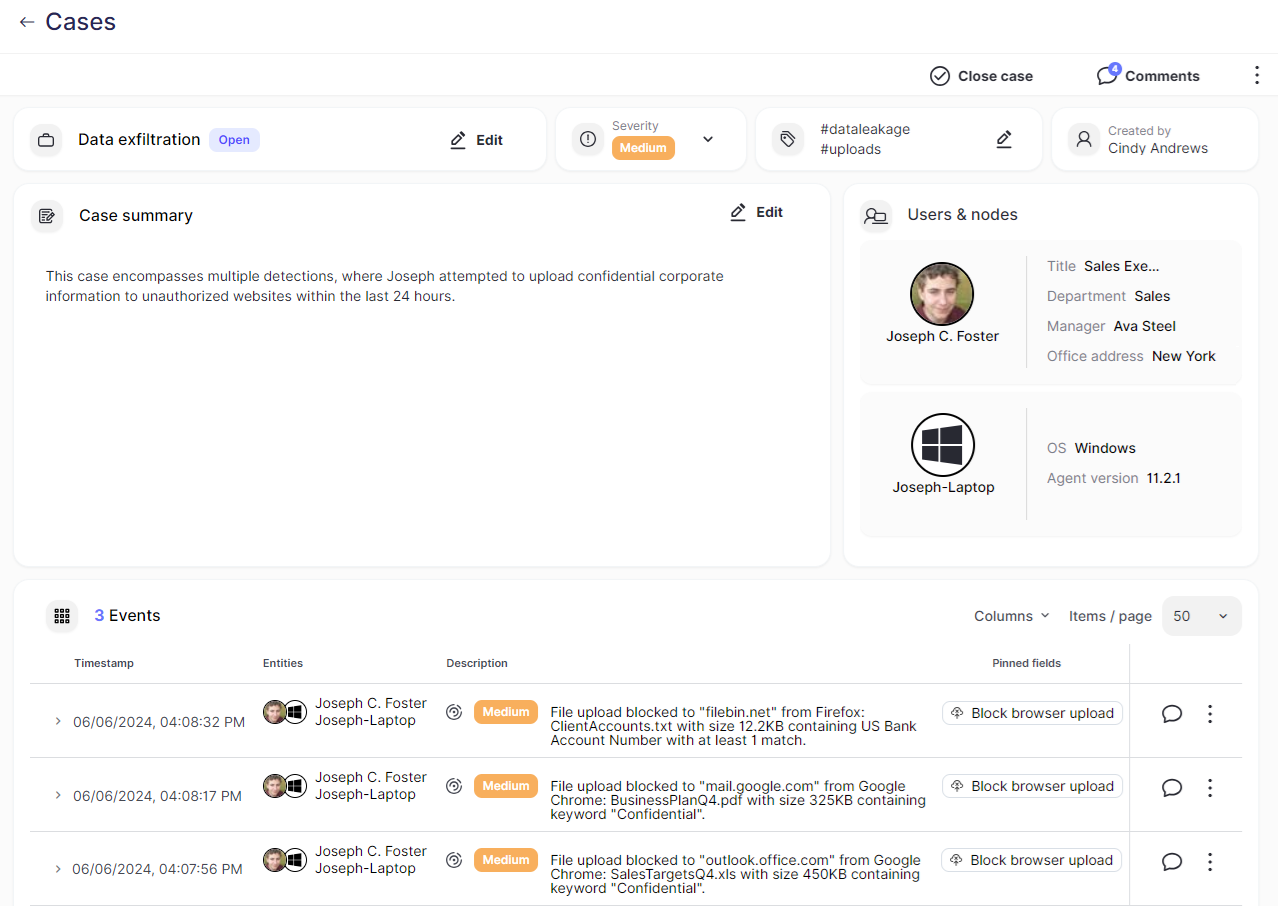When you click a case in the module, you will be directed to the corresponding Case details page. There, you can view case information, such as associated entities and events/detections, and collaborate on the case to accelerate threat analysis. To assist you in sharing information about the case with other operators, you can provide general comments on the case, comment on specific events/detections, and reply to other operators' comments. You can also paste screenshots directly into the Comments panel. You can also quickly access the case's audit log activity from this page.