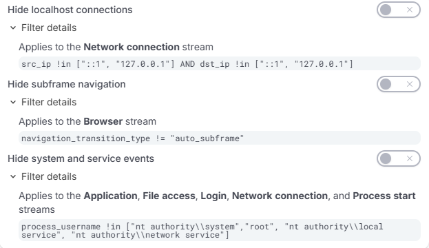 If you turn a default filter off, it will remain off until you turn it on again. This is true even if you log out/in to the FortiDLP Console. Default filters can also be applied from the individual Browser and Network connection event stream pages. |