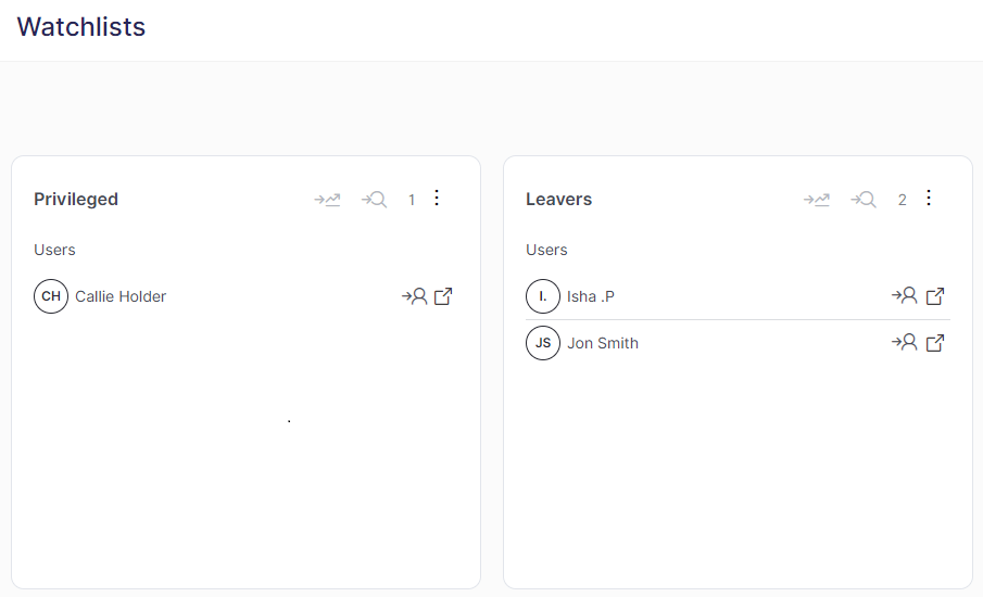 A flagged label called "Leavers" could be used to highlight departing employees, who may pose a threat to company data, within a watchlist. These employees would also be prominently displayed in policy reports and be shown with a |