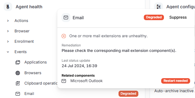 - To view more information about the node's Agent component states, click a component state badge in the Agent health widget. A component is indicated with an image icon to the left of its name, and most are nested within expandable sections. For example, the Email component is nested in the Events section.