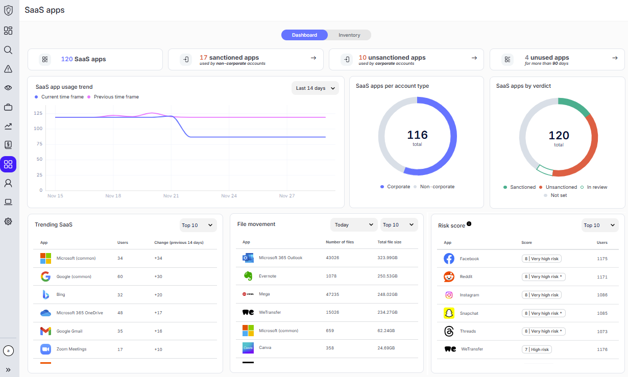 - Dashboard tab: A view that summarizes SaaS app activity in interactive widgets, informing you of the number of apps in the inventory, files that have been transferred from an app, and more.