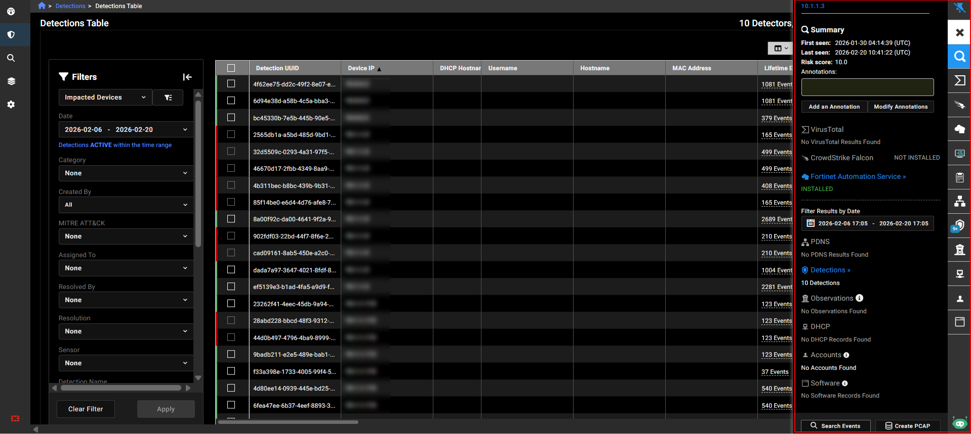 - Click the IP label on the Detections Device Timeline.
