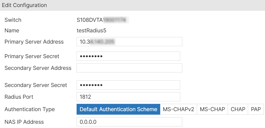 - Select the RADIUS authentication configuration that you want to edit and click Edit.