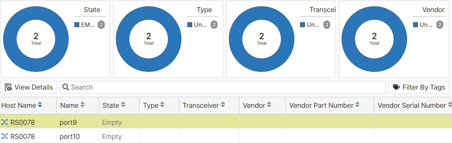 Use the Search field to find a switch serial number, switch host name, port name, state, type, transceiver, vendor, vendor part number, or vendor serial number..