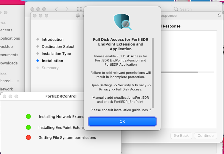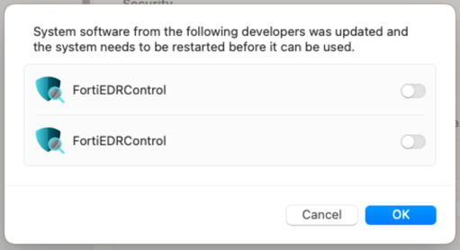 - Toggle on both toggles in order to allow FortiEDR to use Network and System Extensions and click OK.