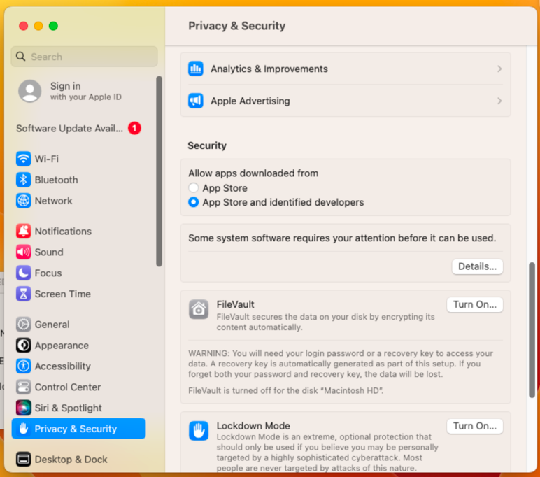 - Open Privacy & Security Preferences and scroll down to the Security section: