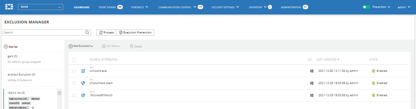 The Exclusion Manager enables you to define which processes or files are excluded from Security Policies monitoring. Two types of exclusions can be defined in the Exclusion Manager: