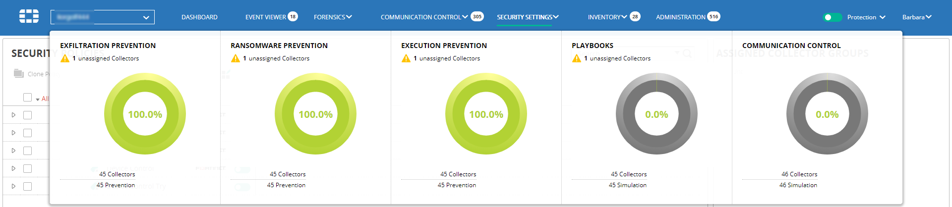 You can click the down arrow next to the Protection/Simulation slider to see an at-a-glance view of the system’s various security policies and their impact on the Collectors in the system.