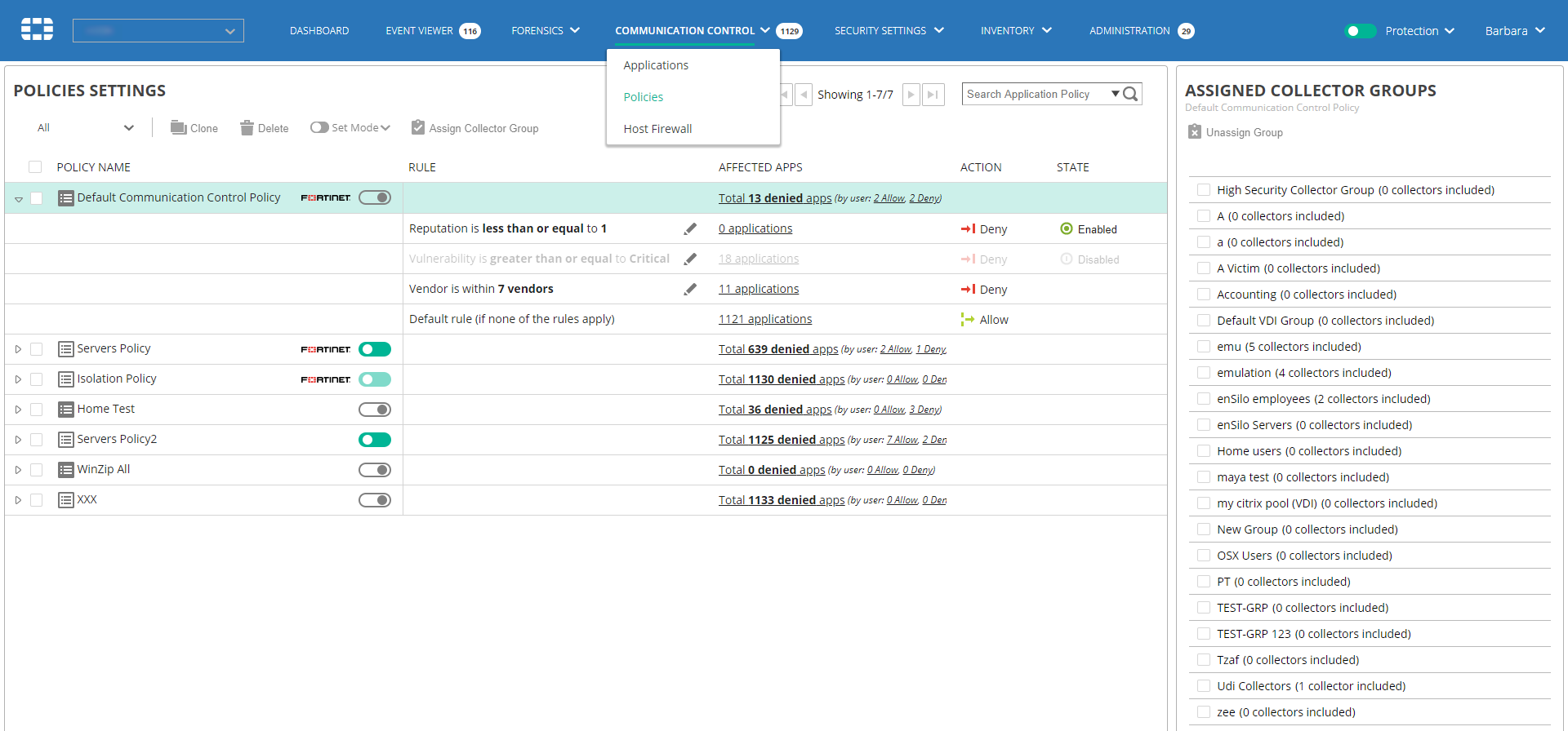 Communication Control policies define the actions to be taken for a given application or application version. Each policy applies to a different Collector Group(s), and all the devices that belong to that Collector Group(s). A Collector Group can only be assigned to one policy.
