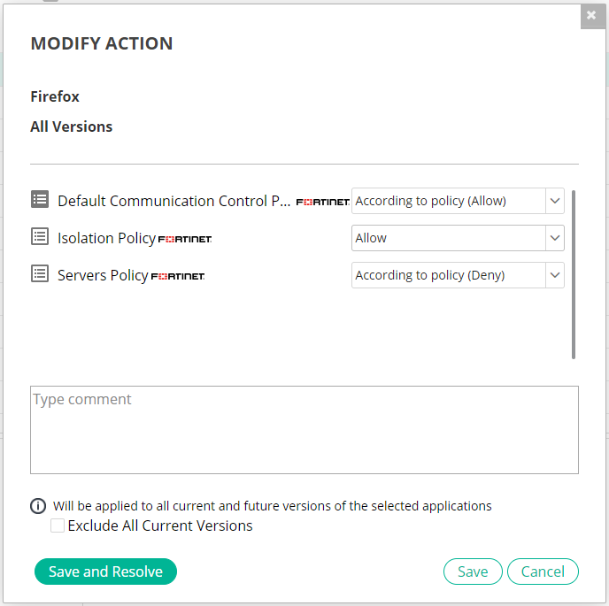 • The Isolation predefined policy isolates (blocks) communication to/from a device. This policy cannot be deleted and only applies in Prevention mode. When this policy is in force and communication for a given device has been blocked, you can manually permit communication to/from the device for a specific application using the procedure below.