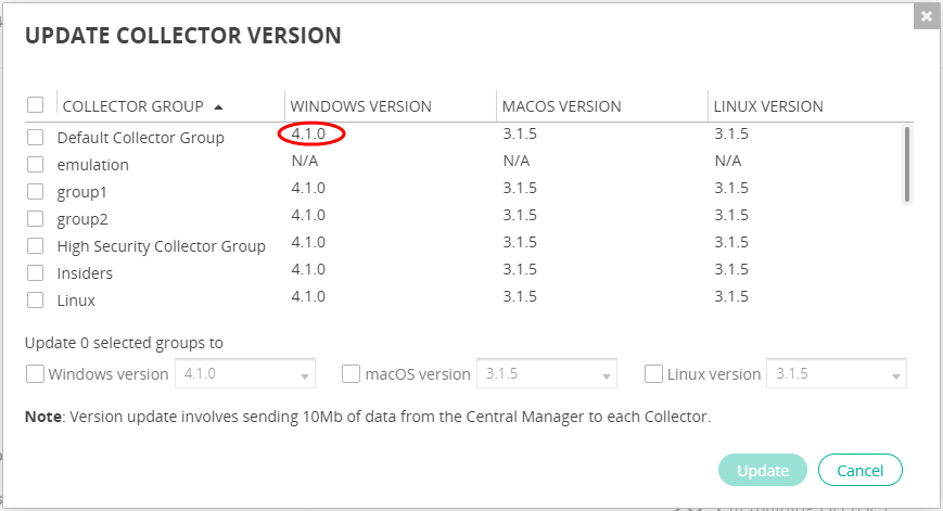 You can update the version for the Collectors in a Collector Group for each operating system.