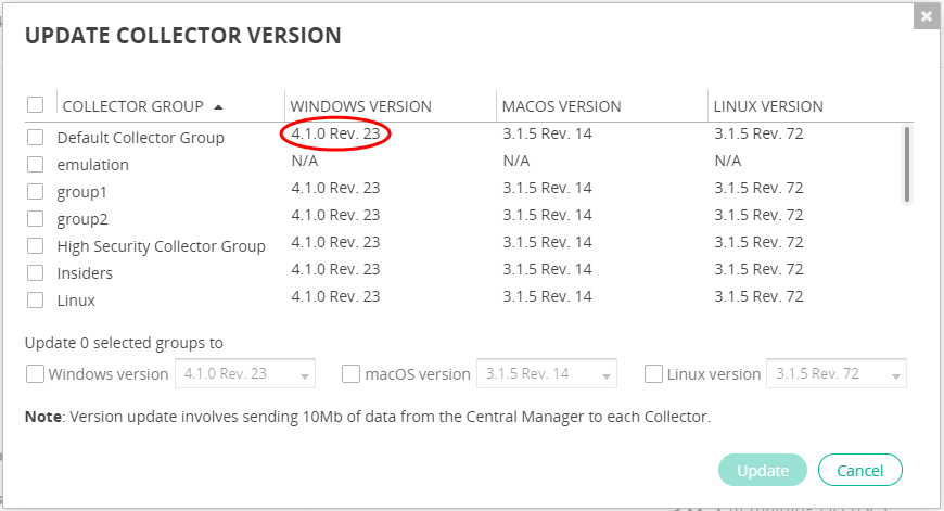 If the Automatically update Collectors to the latest patch version checkbox is enabled in the LICENSING window, then the Update Collector Version window does not display the revision number in the Windows Version, MacOS Version and Linux Version columns, as the revision is automatically updated with the Automatic Updates feature. |