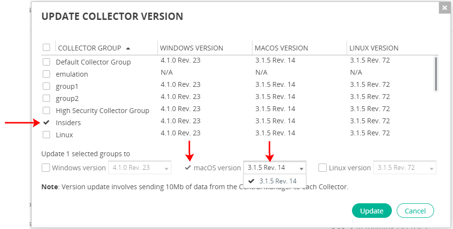 - Check the checkbox of the Collector Group(s) whose Collectors you want to update. You can select more than one Collector Group.