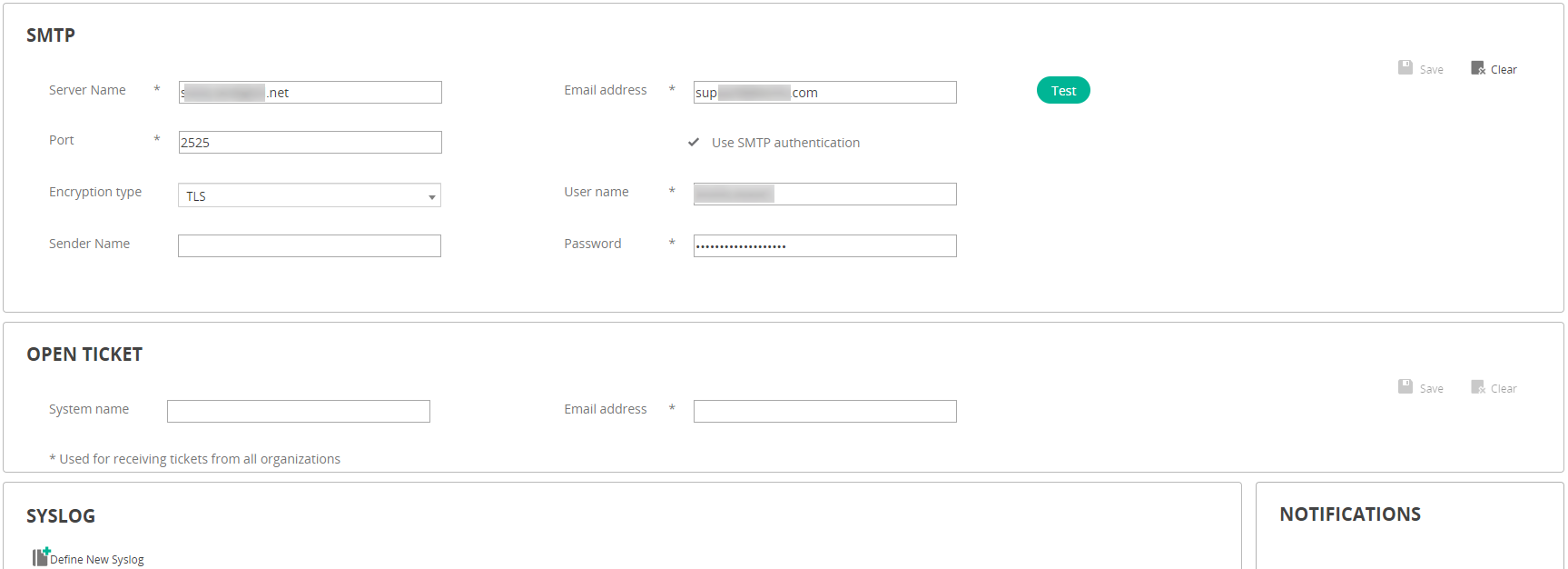 - In the SMTP area, enter standard SMTP settings and then click Save.