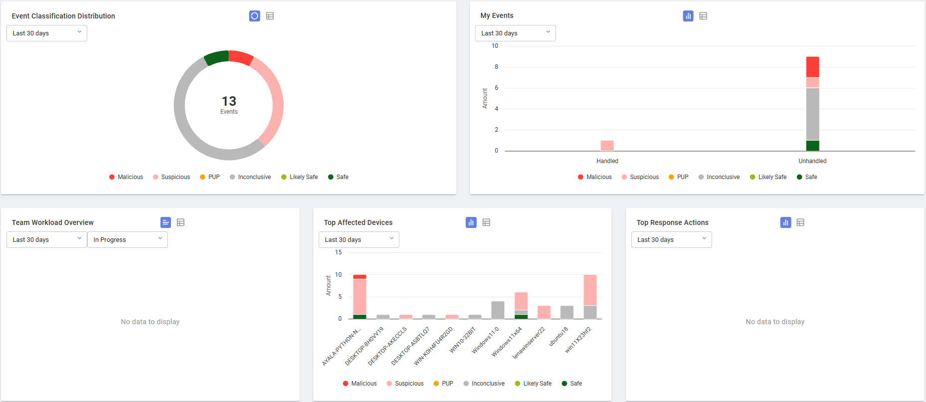 The Event Handling widgets show the number and classification of the FortiEDR security events. The charts and graphs are color-coded according to security event classification: