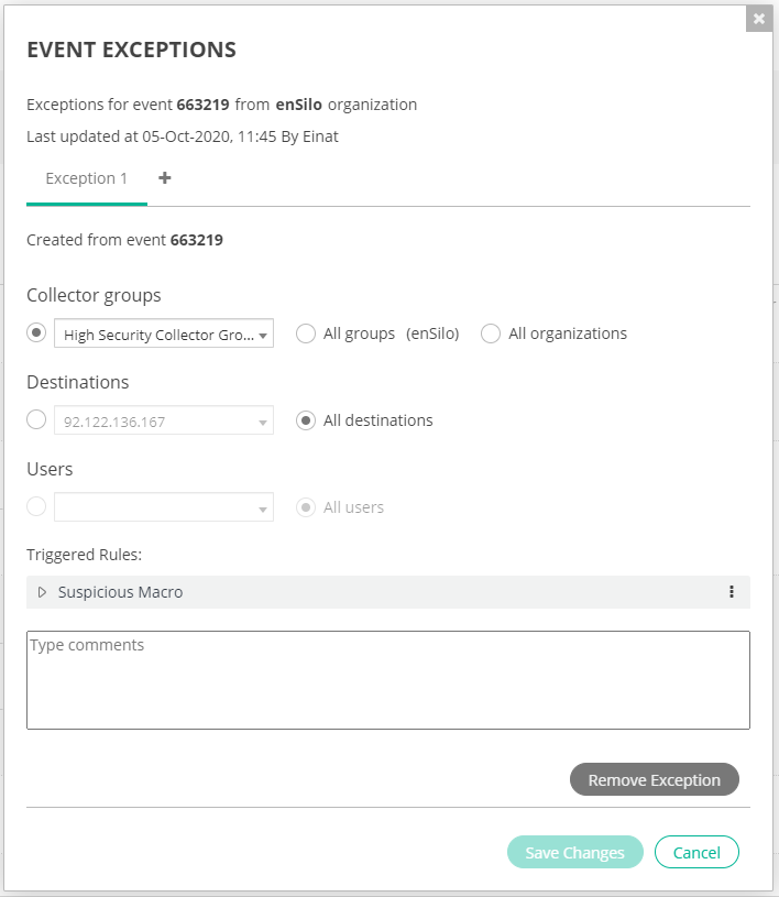 When creating an exception in Hoster view, the organization in which the security event occurred is also shown in the Exception Creation window, as well as the event ID.