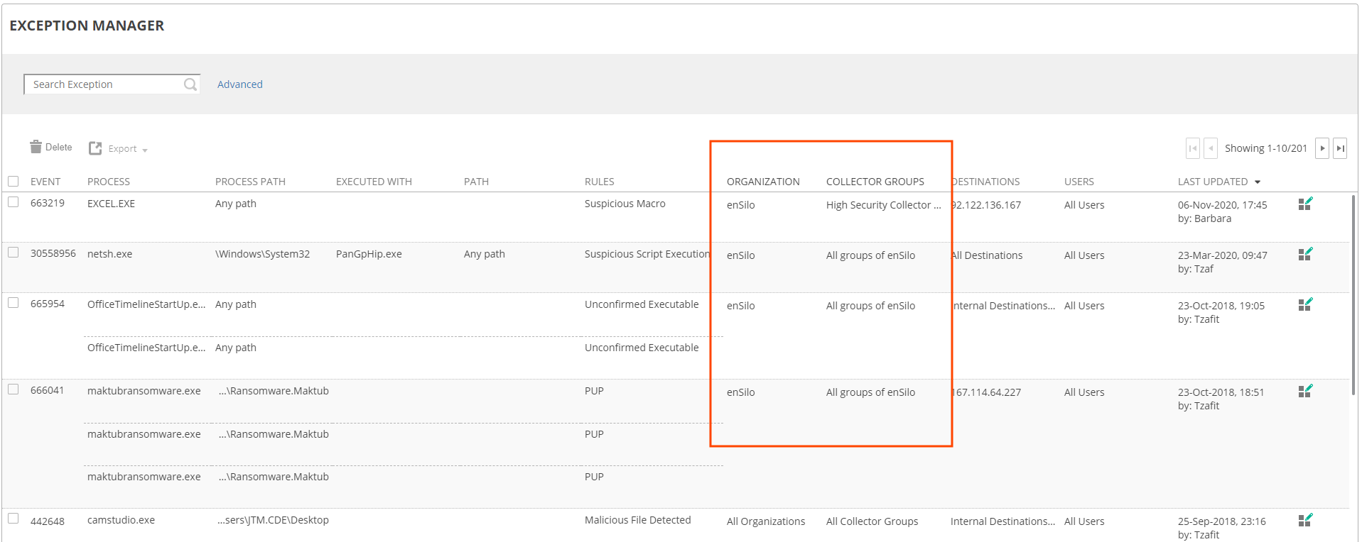 The Exception Manager page also shows the organization to which the exception applies. In addition, the Collector Groups column indicates the Collector Groups to which the exception applies.