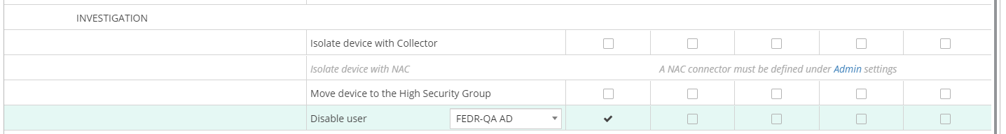 - Place a checkmark in the relevant Classification column next to the Disable user row under the INVESTIGATION section or the Reset user password row under the REMEDIATION section.