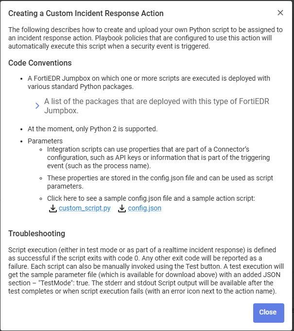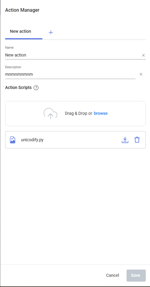 Name Enter any name for this action. Description Enter a description of this action. Upload Upload a Python script that calls an API from the third-party system in order to perform the relevant action. Python 2.7 or later is supported. The Python script must be created according to the coding conventions that can be displayed by clicking the