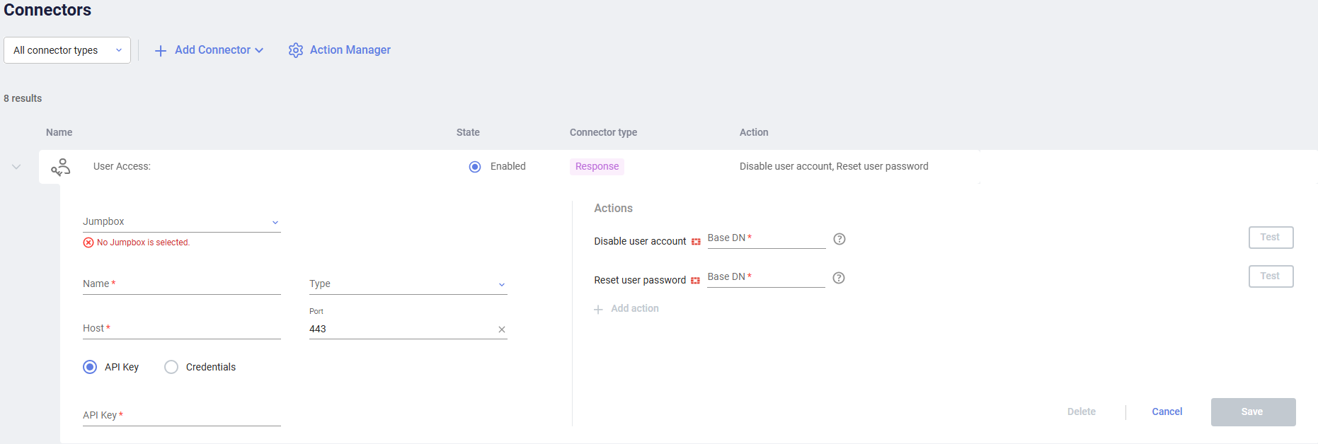 - In the dropdown menu next to the relevant custom action, select the relevant User Access connector with which to perform the action.