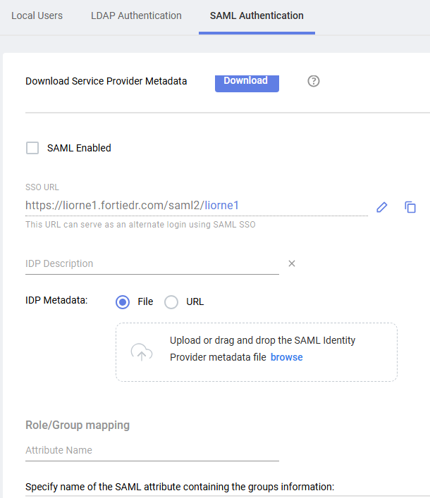 - Click the Download button to download and save SP data from FortiEDR, which is used by your IdP server during SAML authentication. Then, upload this FortiEDR data as is to your IdP server using a standard method.