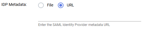 IDP Description Specify a free-text description. For example, you may want to specify the IdP server that you are using here. IDP Metadata Upload the IdP metadata to FortiEDR. You can either upload an XML file or a URL. To upload a file, click the File radio button and then click the Select File button to navigate to and select the applicable *.XML file. To upload a URL, click the URL radio button and then specify the requisite URL.