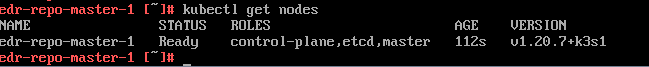 kubectl get nodescommand and checking that the status of edr-repo-master1 is Ready, as shown below. If you installed three nodes, verify that the status of the other two nodes are Ready as well.