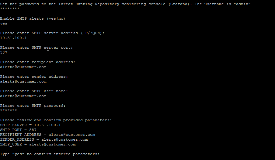 yesif you want to receive alert emails triggered by the Threat Hunting Repository monitoring. Otherwise, enternoand skip to step 7. - When prompted, provide the following information of the SMTP server: