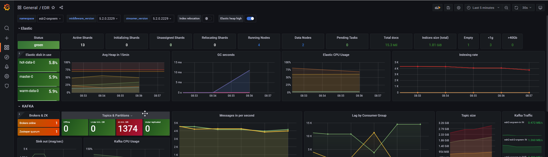 No events from core Verify that all Cores are an running by using the FortiEDR Manager. Consumer Lag (offset) Contact Fortinet Support. OpenDistro Unhealthy Cluster OpenDistro CPU usage too high OpenDistro heap size too large OpenDistro too many shards per node OpenDistro slow search query OpenDistro slow search fetch OpenDistro disk usage ES pod in crashloop Kafka Offline Partitions Kafka broker is down Kafka cluster failed Kafaka broker restart rate high Kafka broker disk low ZooKeeper disk low Streamer restart rate high StreamerSink restart rate high ZooKeeper restart too often Streamer MAX HPA Streamer unreached desired HPA Middleware restart rate high