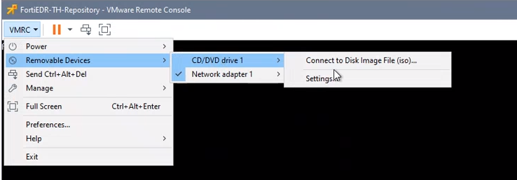 - From the VMRC menu, select Removable Device > CD/DVD drive 1 > Connect to Disk Image File (iso)....