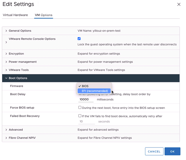 - In the Virtual Machine Boot Options, select BIOS under Firmware, and click OK.