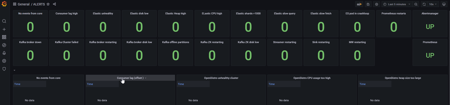 No events from core Verify that all Cores are an running by using the FortiEDR Manager. Consumer Lag (offset) Contact Fortinet Support. OpenDistro Unhealthy Cluster OpenDistro CPU usage too high OpenDistro heap size too large OpenDistro too many shards per node OpenDistro slow search query OpenDistro slow search fetch OpenDistro disk usage ES pod in crashloop Kafka Offline Partitions Kafka broker is down Kafka cluster failed Kafaka broker restart rate high Kafka broker disk low ZooKeeper disk low Streamer restart rate high StreamerSink restart rate high ZooKeeper restart too often Streamer MAX HPA Streamer unreached desired HPA Middleware restart rate high