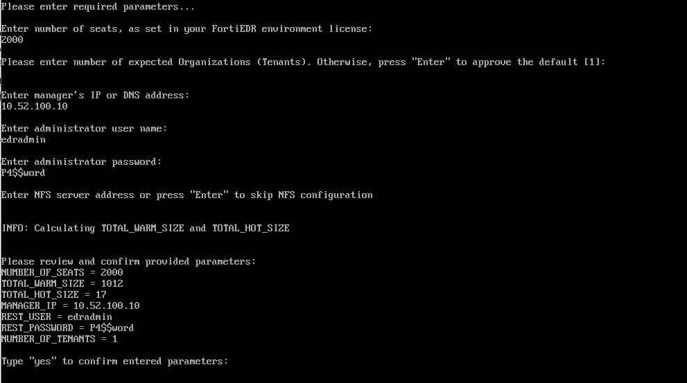 yesin the previous question, provide the number of expected organizations (meaning Tenants).- When prompted for the FortiEDR Manager details, provide its IP and the credentials of one of the FortiEDR Console administrators that have Rest API permissions.